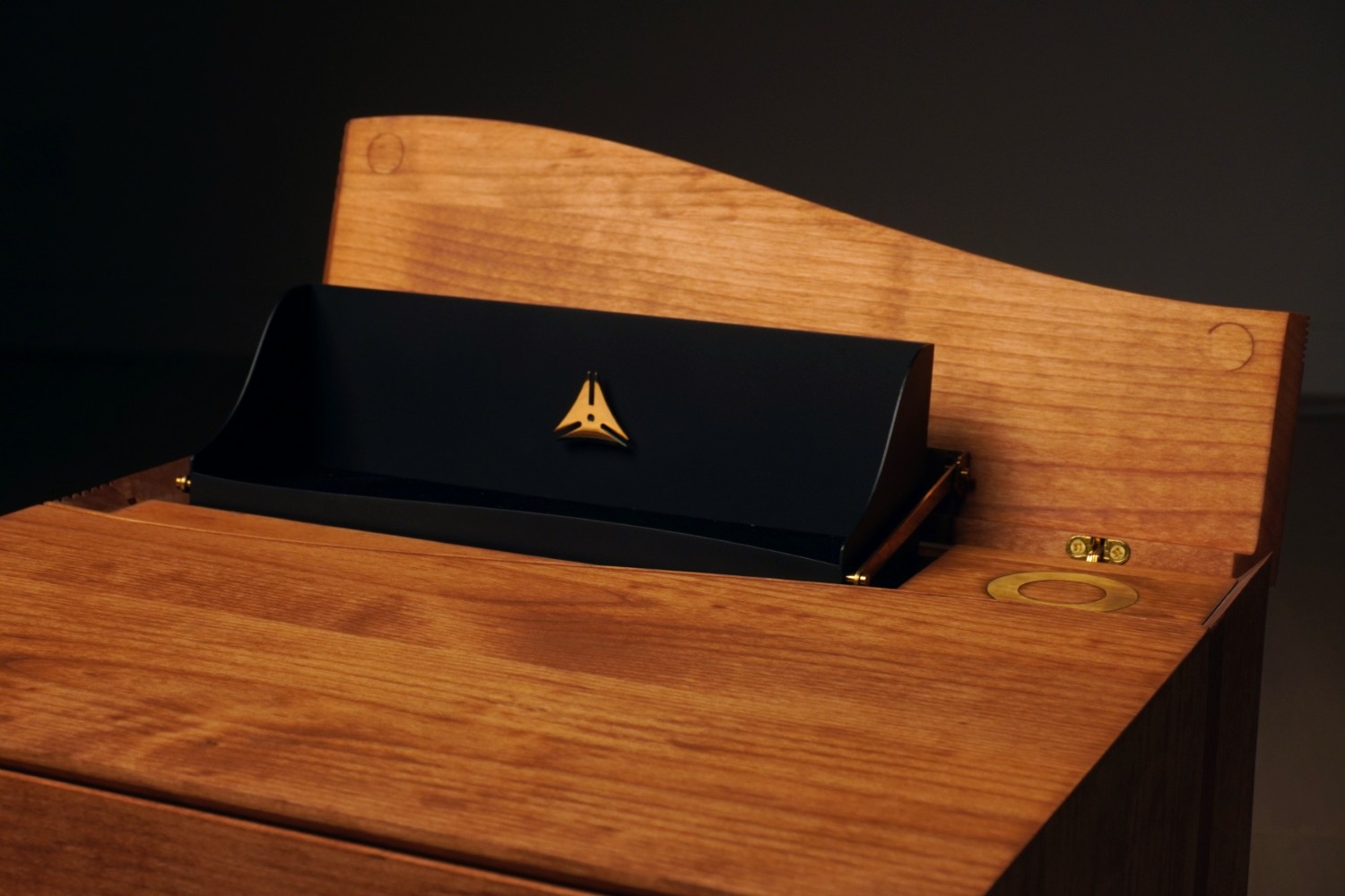 Concealed inside is a brass scissor lift engineered with the devotion of watchmakers.